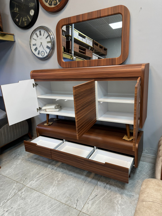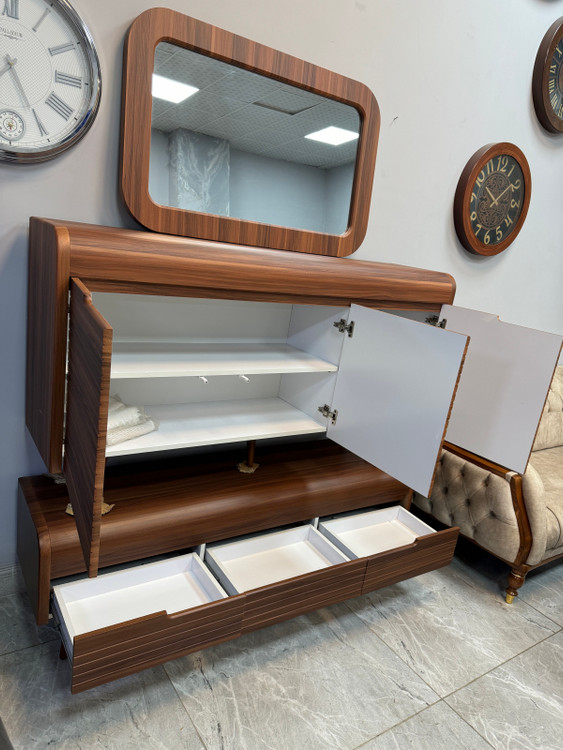 کنسول دارای 3 درب میباشدو مسز تلوزیون دارای 3 کشو مگنتی و زیر میز هم دوتا فضا برای قرار گیری رسیور موجود هست.